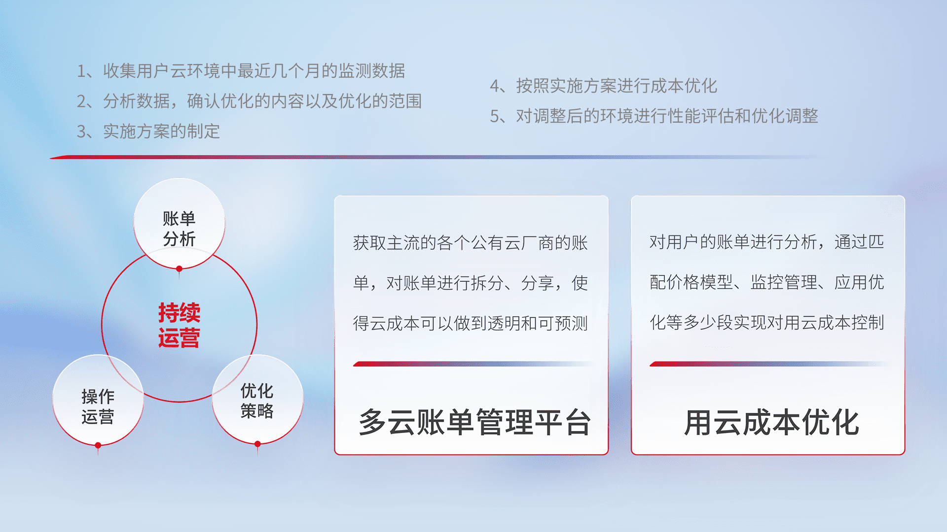 通过多云纳管,,,,以统一的资源数据模型把客户的云资源进行抽象和封装,,,进而实现对多云资源的统一操作,,,,保障云资源管理的可靠性、、稳定性与可用性。。。。量身定制化运维内容,,,,配置、、开发运维、、、、补丁管理、、、备份、、、监控、、认证和访问管理、、、、审计和日常巡检等,,保障在用云过程中的可靠度,,,,稳定度以及高可用率。。
